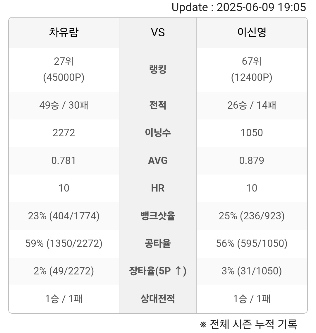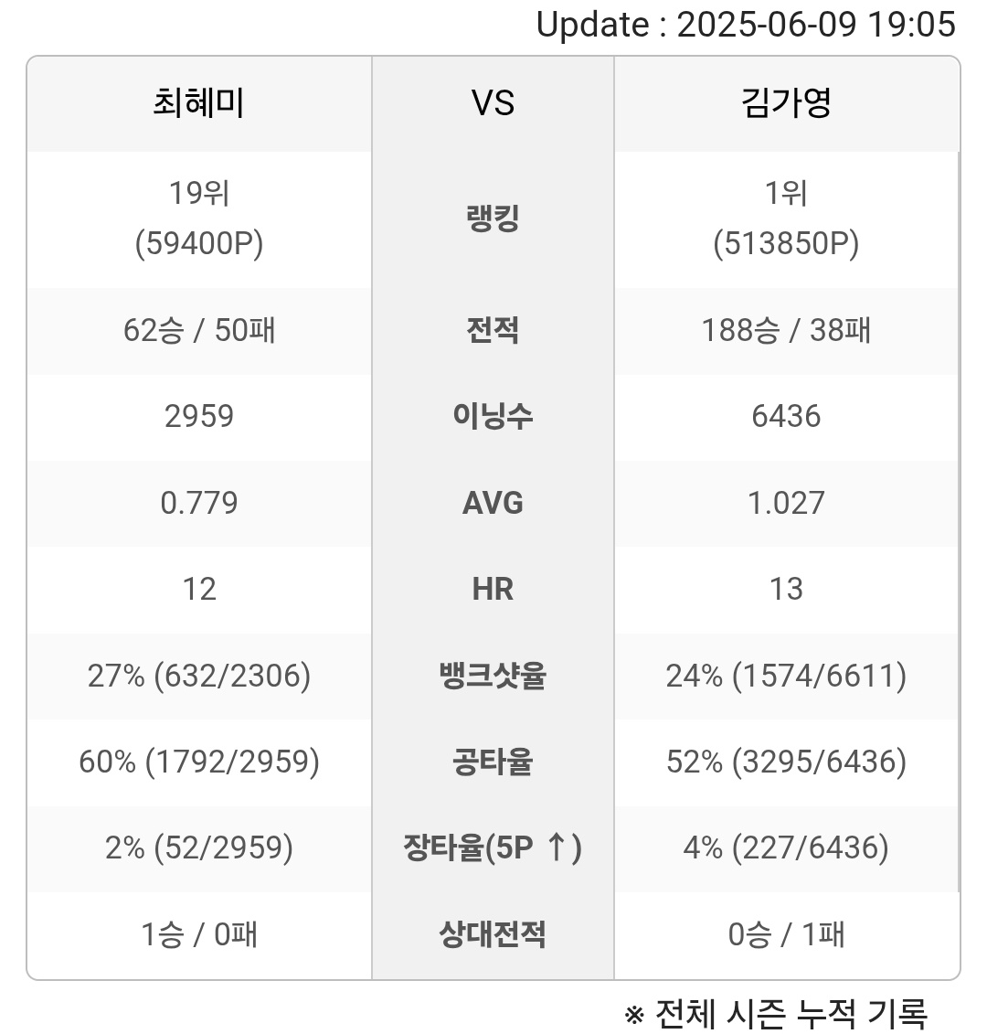 ※ 진행중인 시즌은 시즌이 종료된 이후에 최종 반영됩니다.