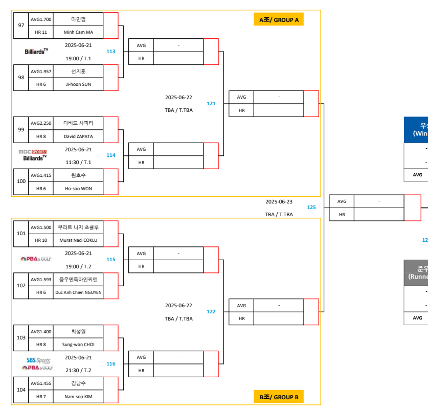 | 우리금융캐피탈 PBA 챔피언십 32강 대진표 (프로당구 2025-26) (2) | 2025.06.20 |