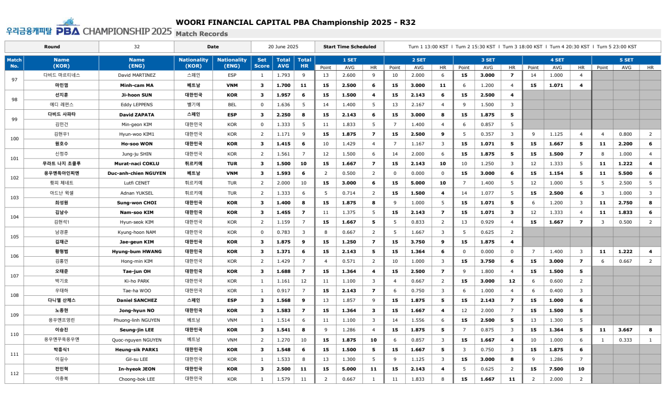 우리금융캐피탈 PBA 챔피언십 32강 경기 결과