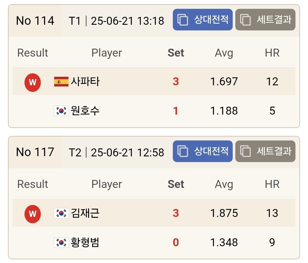 | 우리금융캐피탈 PBA 챔피언십 4강 대진표 8강 경기결과 (프로당구 2025-26) (2) | 2025.06.22 |