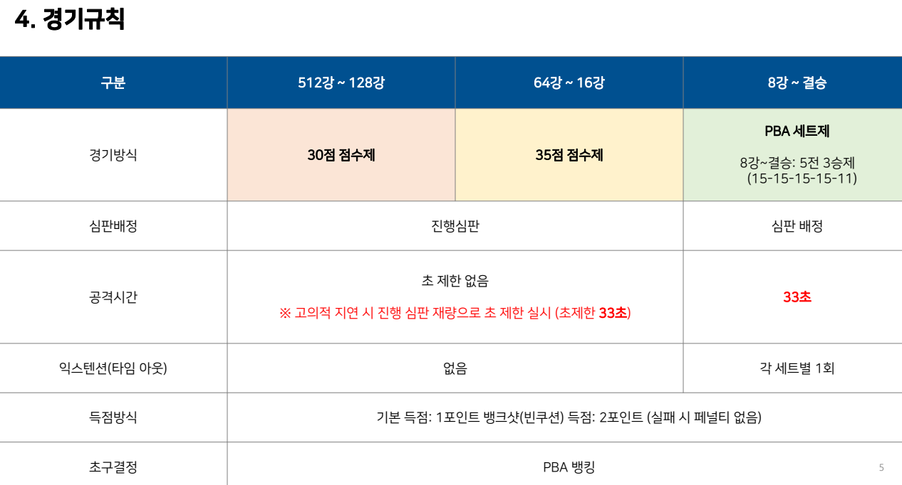 PBA 드림투어 경기방식이 PBA투어와 가장 큰 차이점은 예선에 해당하는 512강 ~ 128강은 30전 점수제로, 이후 16강까지는 35점 점수제로 펼치지는 점입니다. 이후 8강부터는 PBA투어 경기방식을 적용하여 세트제로 펼쳐집니다.