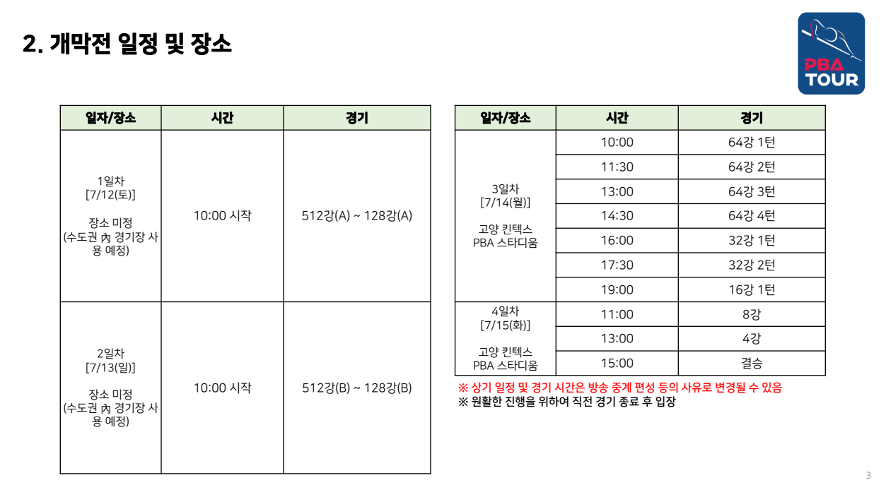 - 3~4일차 (7월 14~15일): 고양 킨텍스 PBA 스타디움 (일산서구 킨텍스로 217-59)