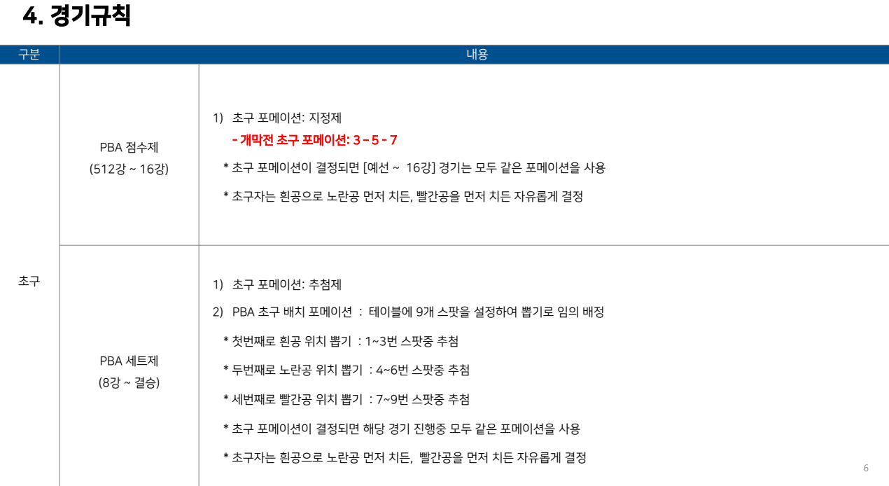 그만큼 뜨거운 여름을 더욱 뜨겁게 달굴 이번 대회는 수도권 경기장에서 예선을 시작으로, 고양 킨텍스 PBA 스타디움에서 결승까지 펼쳐질 예정입니다. 이번 포스팅에서는 대회의 전반적인 정보와 규칙, 상금 내역까지 자세히 소개드립니다.