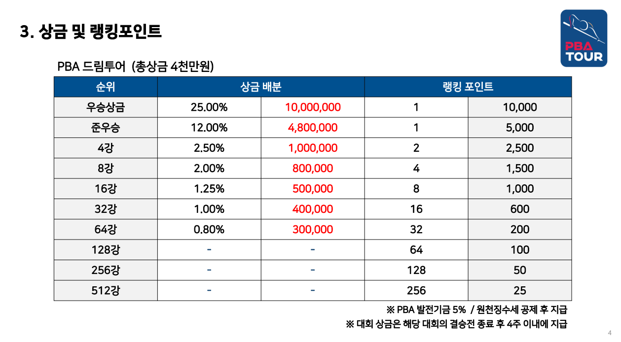 💰 PBA 드림투어 총상금 및 랭킹 포인트
