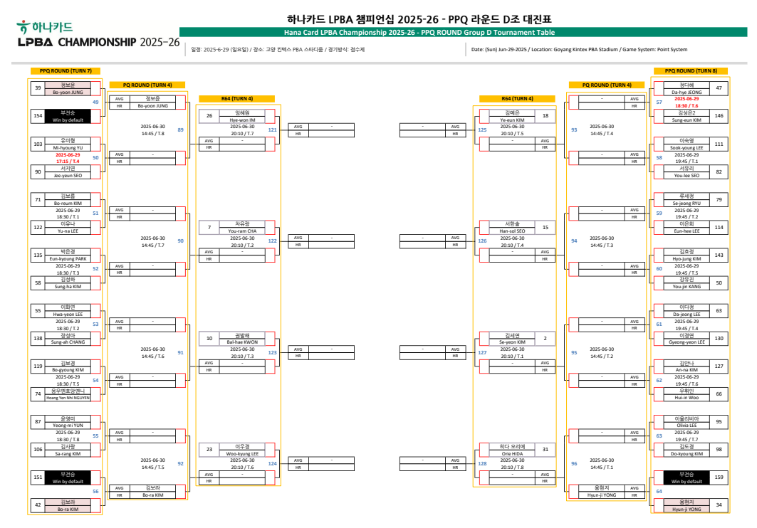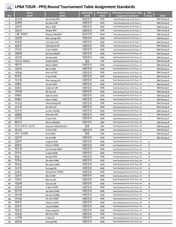 하나카드LPBA 챔피언십 PPQ 라운드 할당 기준은 프로당구협회에서 최근 10개 투어 (LPBA챔피언십 또는 월드 챔피언십) 성적을 기준으로 상위 32명의 선수는 바로 64강 대진표로 직행합니다. 33강부터 147강 까지의 선수는 예선 1차전에 해당하는 PPQ라운드부터 경기를 펼칩니다.