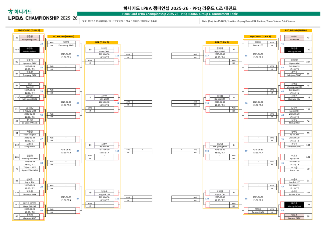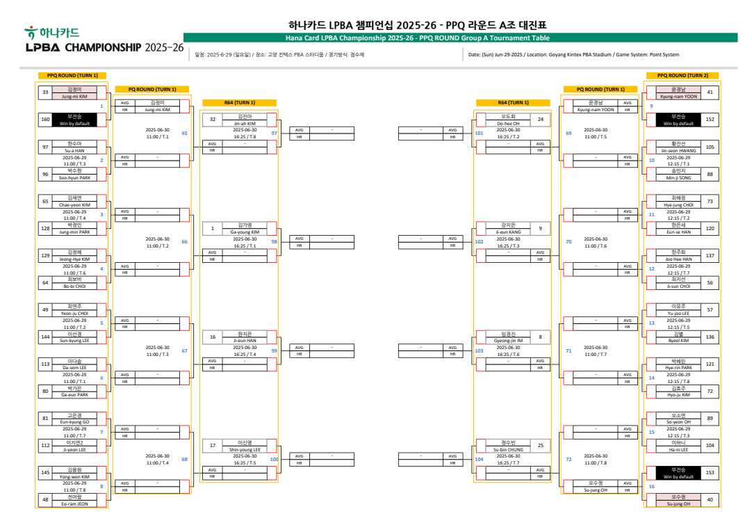 안녕하세요. 오늘은 프로당구 2025-26시즌 하나카드LPBA 챔피언십 PPQ 라운드 대진표를 정리했습니다. 대진표를 보기전에 먼저 PPQ 라운드 할당 기준부터 보고 가겠습니다.