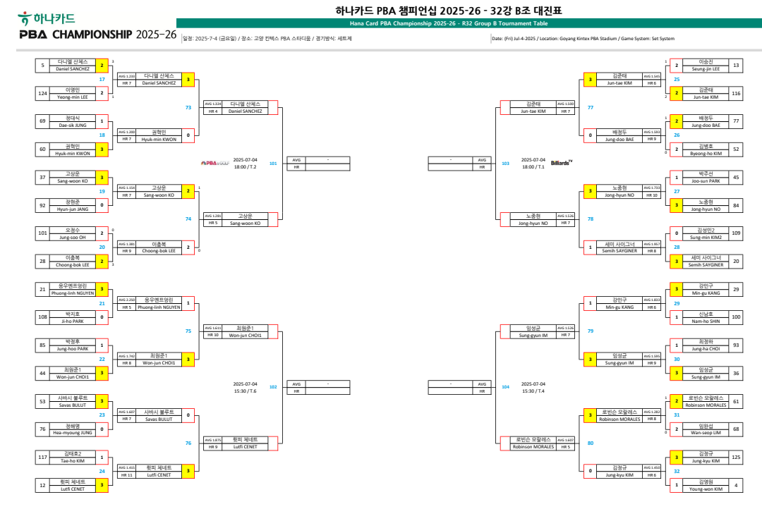 프로당구 2025-2026시즌 개막전, 하나카드 PBA 챔피언십 32강 B조 대진표입니다. 다니엘 산체스는 고상운 선수와 경기를 펼칩니다. PBA 원년 챔피언 최원준 선수는 터키의 륏피 체니트와 경기를 펼칩니다.