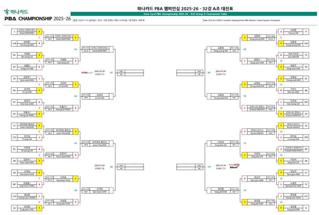 하나카드 PBA 챔피언십 32강 대진표 (프로당구 20245-26시즌)