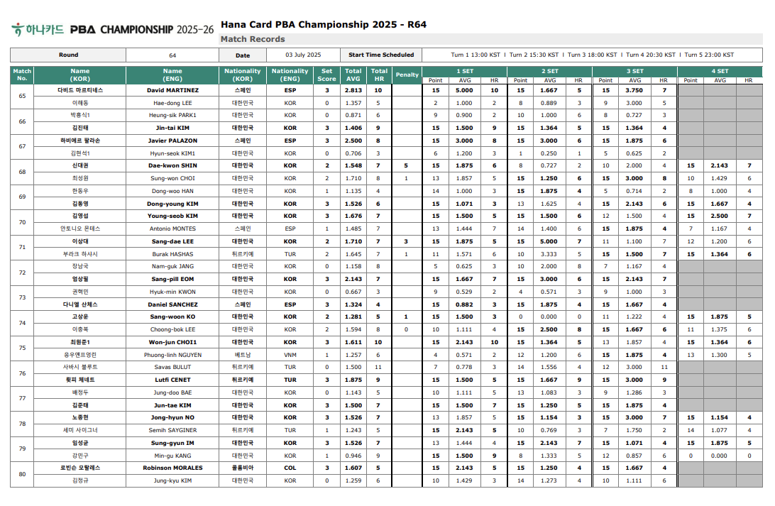 그럼 지금부터 하나카드 PBA 64강 경기결과를 먼저 확인하고, 바로 이어서 32강 대진표를 살펴 보겠습니다.