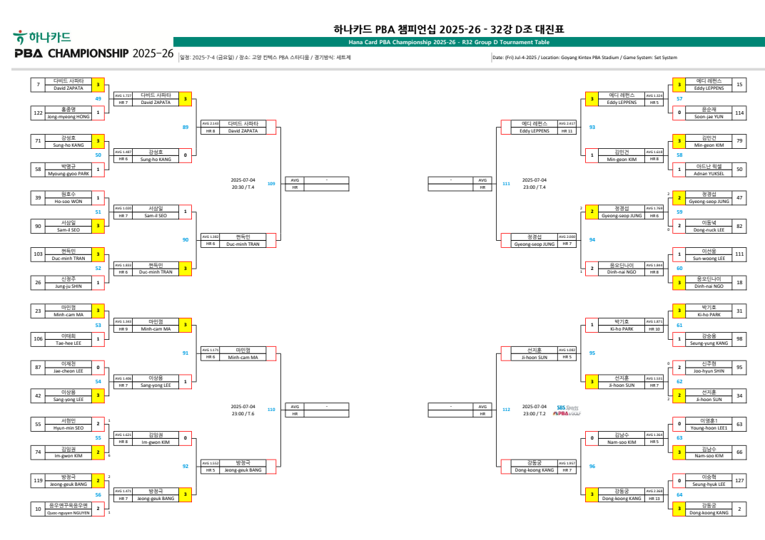 프로당구 2025-2026시즌 개막전, 하나카드 PBA 챔피언십 32강 D조 대진표입니다. 다비드 사파타는 쩐득민 선수와 32강 경기를 펼칩니다.