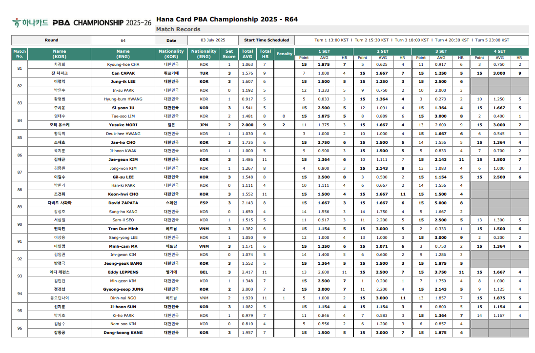 하나카드 PBA 챔피언십 64강 경기 결과