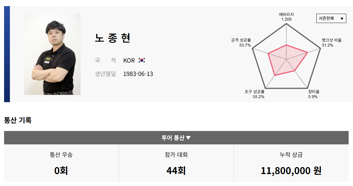 ■ 노종현 당구선수의 PBA 프로당구 지표
