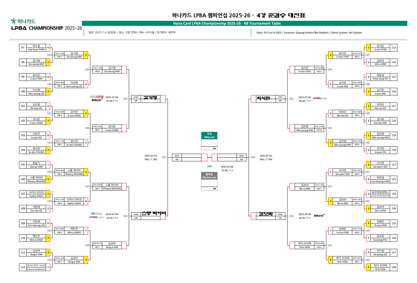 | 하나카드 LPBA 챔피언십 8강 대진표 - 16강 경기결과(2025-26시즌) (4) | 2025.07.04 |