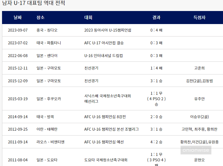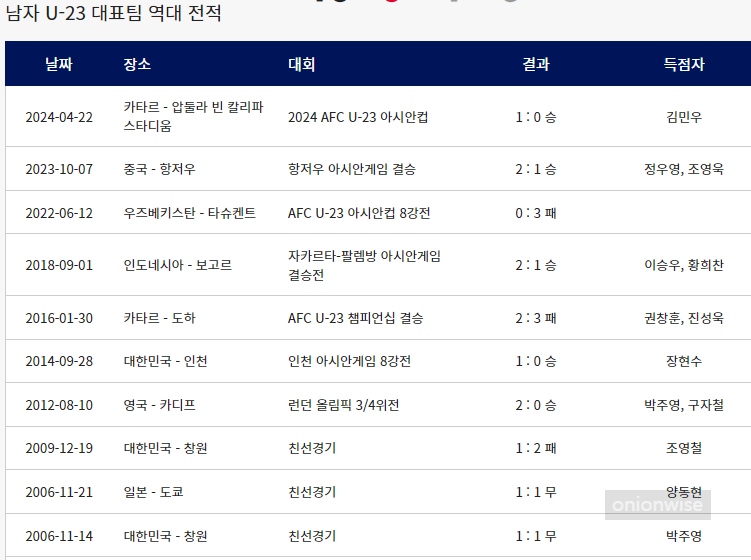 횟수 날짜 장소 대회 결과 득점자
