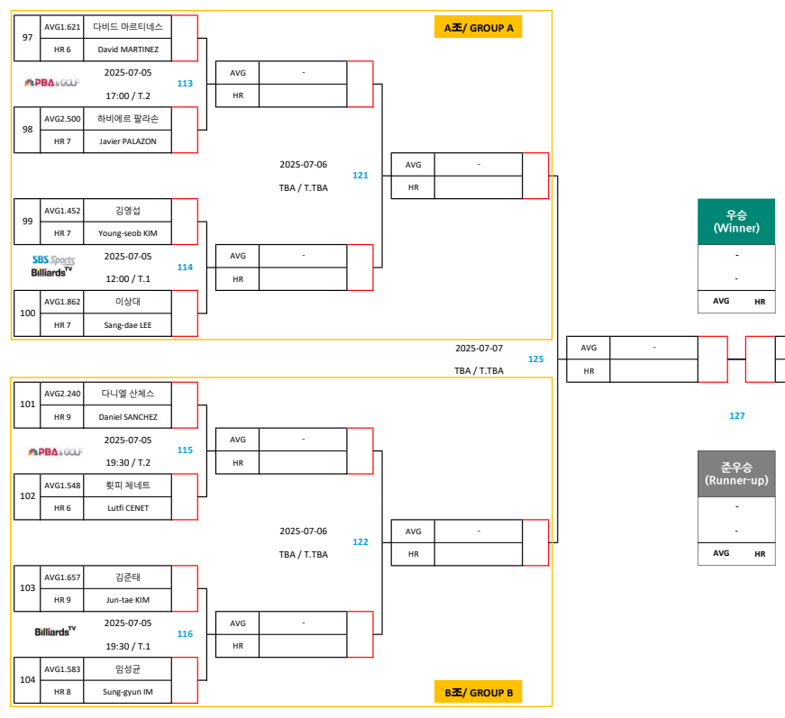 | 하나카드 PBA 챔피언십 4강 대진표 - 8강 경기결과(2025-26시즌) (1) | 2025.07.06 |