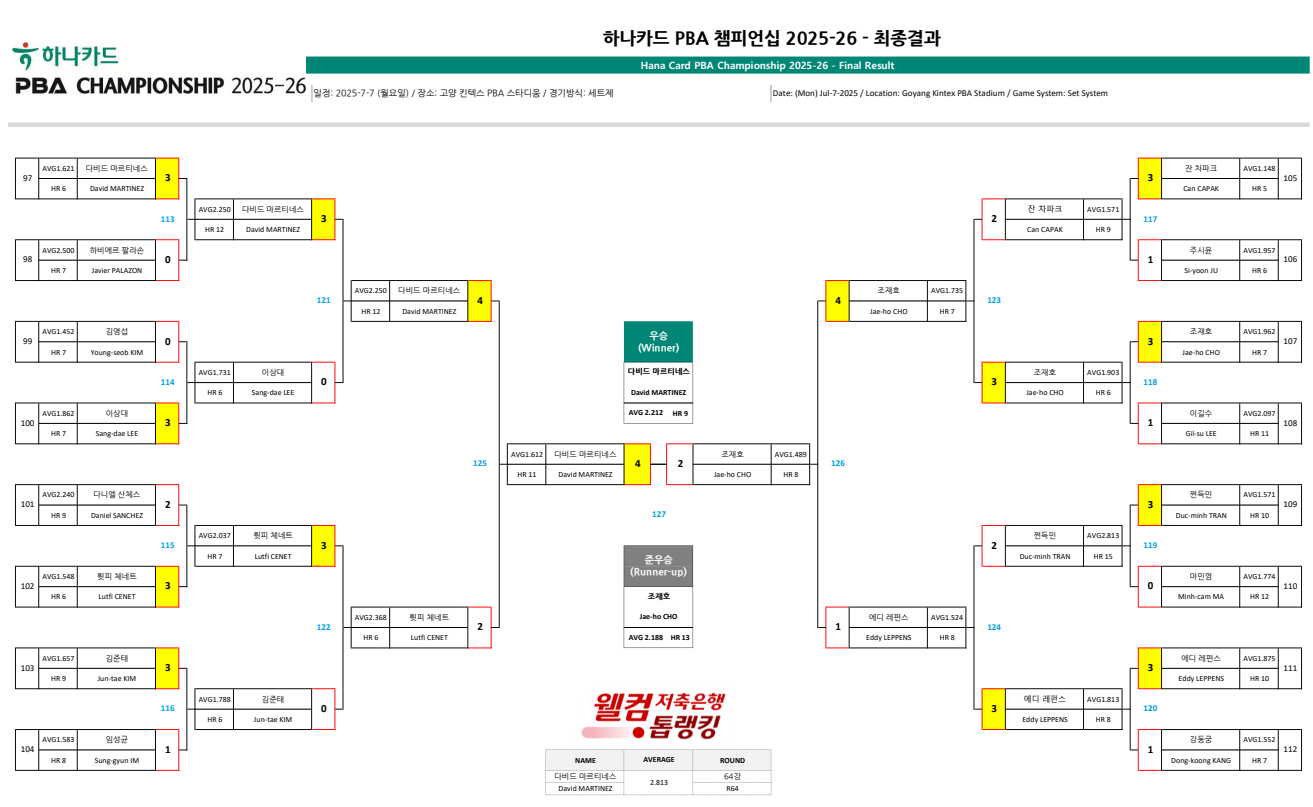 2025-2026시즌 하나카드 PBA 챔피언십 결승전 경기결과, 우승자는 마르티네스, 준우승자는 조재호로 확정되었습니다. 이로써 마르티네스는 쿠드롱과 타이기록인 PBA 8회 우승을 차지하며, 누적 상금 10억을 돌파하였습니다.