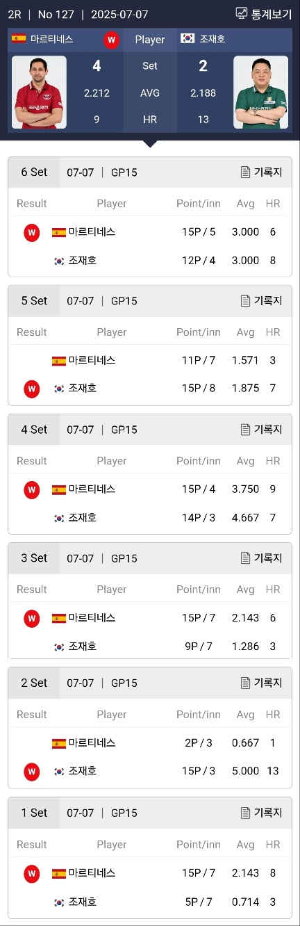 조재호 선수는 2세트와 5세트를 승리하며, 추격의 불씨를 살려나갔으나 마르티네스가 6세트를 15:12로 마무리하면서 승부에 종지부를 찍었습니다. 여자당수의 김가영만큼은 아니지만 1990년대 출생인 다비드 마르티네스는 당분간 PBA 전성시대를 이어갈 것으로 전망됩니다.