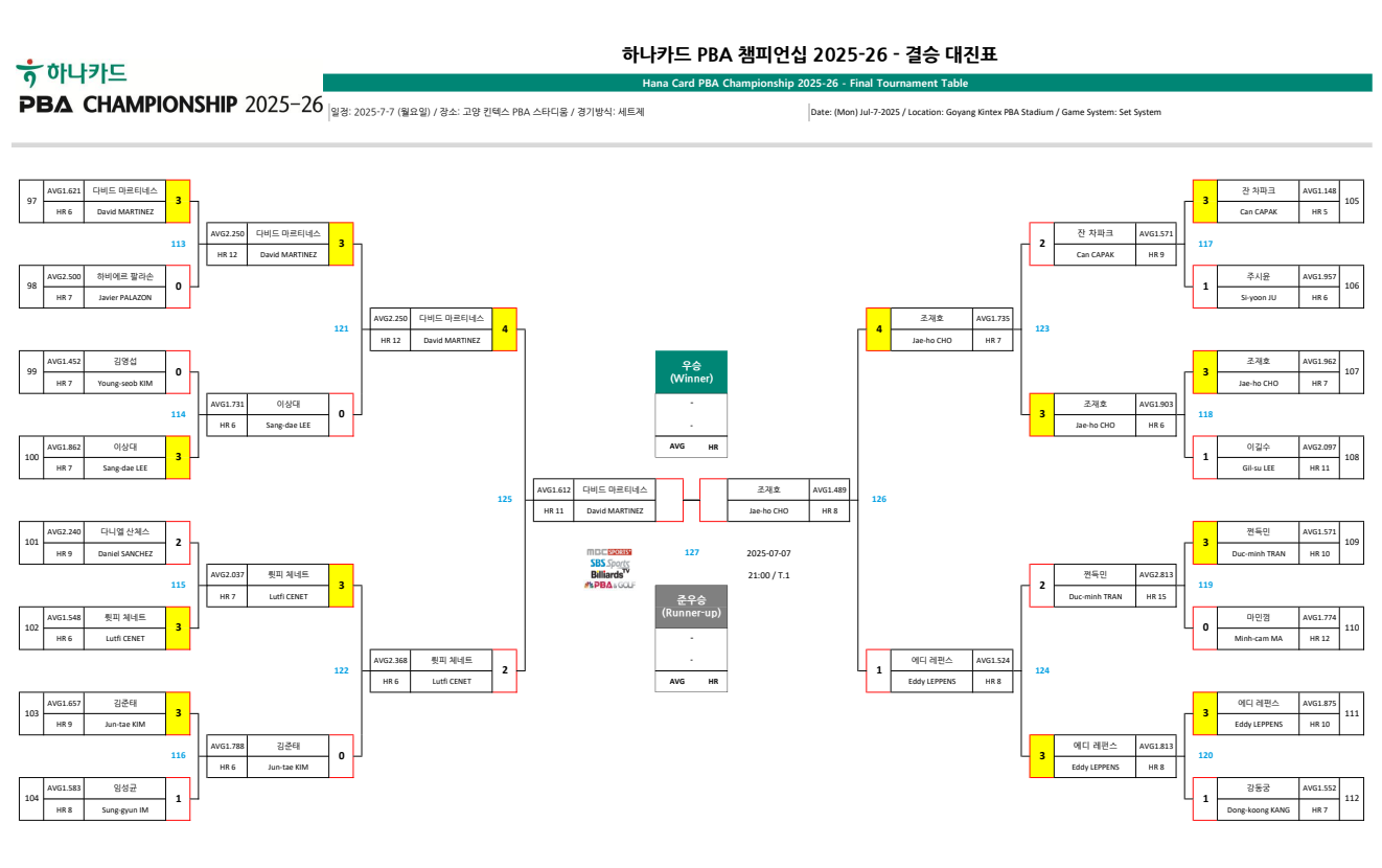 2025-2026시즌 하나카드 PBA 챔피언십 결승전 경기결과, 우승자는 마르티네스, 준우승자는 조재호로 확정되었습니다. 이로써 마르티네스는 쿠드롱과 타이기록인 PBA 8회 우승을 차지하며, 누적 상금 10억을 돌파하였습니다.