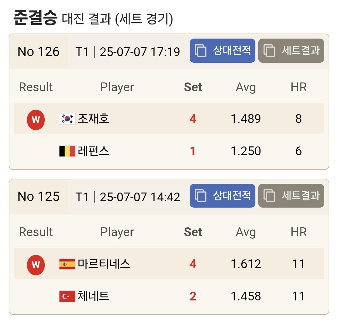 먼저 프로당구 2025-26시즌 2차대회 하나카드 PBA 챔피언십 4강 경기결과 입니다. 첫번째 4강 경기, 다비드 마르티네스와 륏피 체네트 (루피 체넷)의 경기 결과는 마르티네스그 3대1 2로 체네트를 이기고 결승에 올랐습니다.