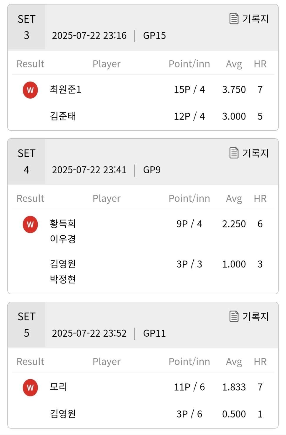 5세트에서 남자 단식으로 나선 10대 PBA 챔피언, 김영원 선수가 불씨를 살리나 싶었지만 일본당구선수 모리 유스크에게 11:3으로 패하며 패배가 확정되었습니다. 오늘 경기에서는 특히 에스스 전에서 김준태를 역전승으로 이긴 최원준 선수의 경기력이 너무 멋졌습니다.