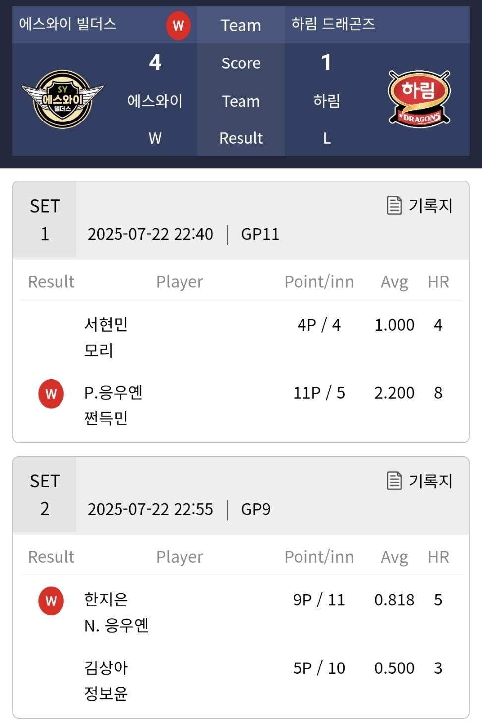 에스와이 빌더스 VS 하림 드레곤즈 당구팀간의 경기에서는 1세트를 베트남 남자 복식 콤비, 쩐득민과 응우옌이 승리하며 좋은 출발을 했습니다. 하지만 이어서 나선 여자 복식 (김상아, 정보윤), 남자단식 김준태, 남년 혼복 (김영원, 박정원) 연패하면서 패색이 짙어졌습니다.