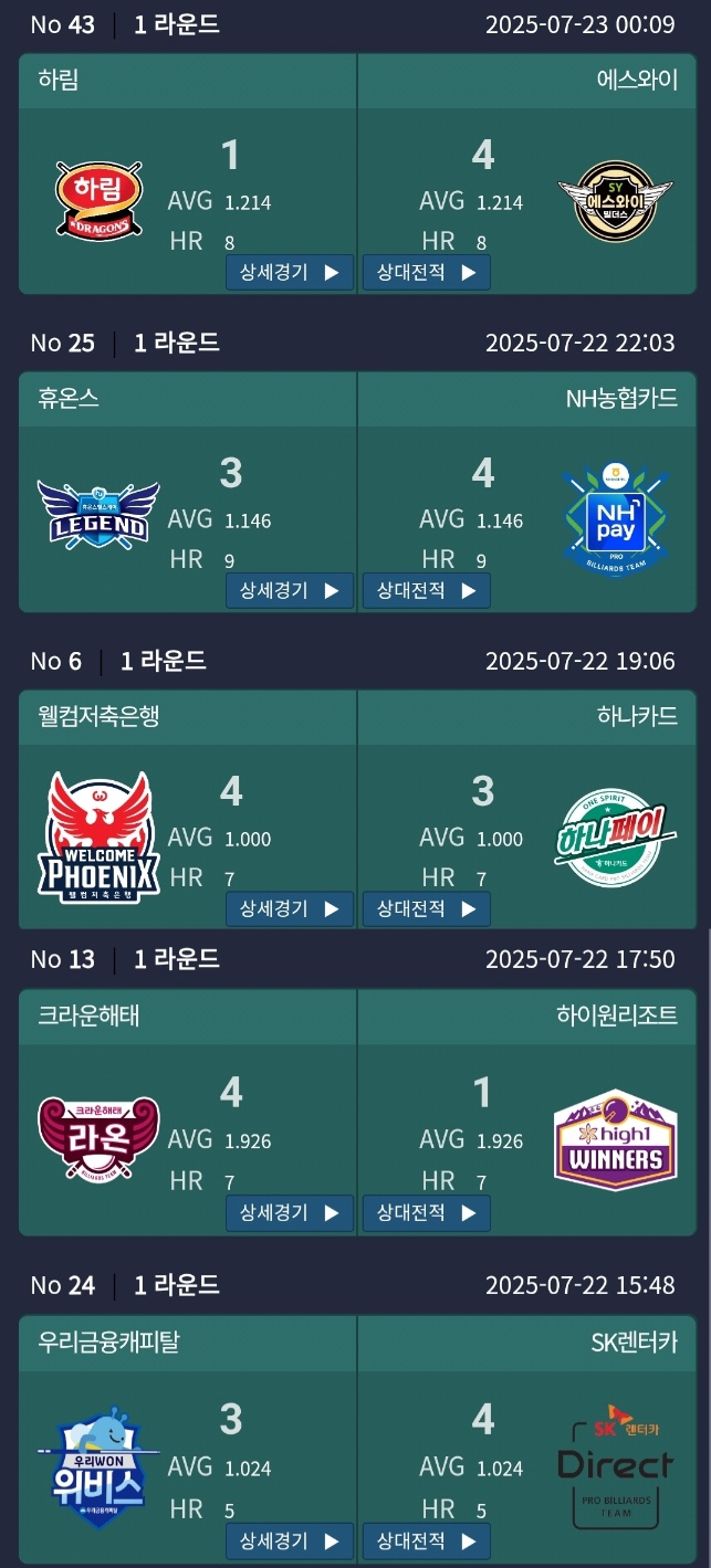 | 2025-26시즌 PBA 팀리그 1라운드 3일차 경기결과 순위 - 1위 우리금융캐피탈 당구팀 (0) | 2025.07.25 |