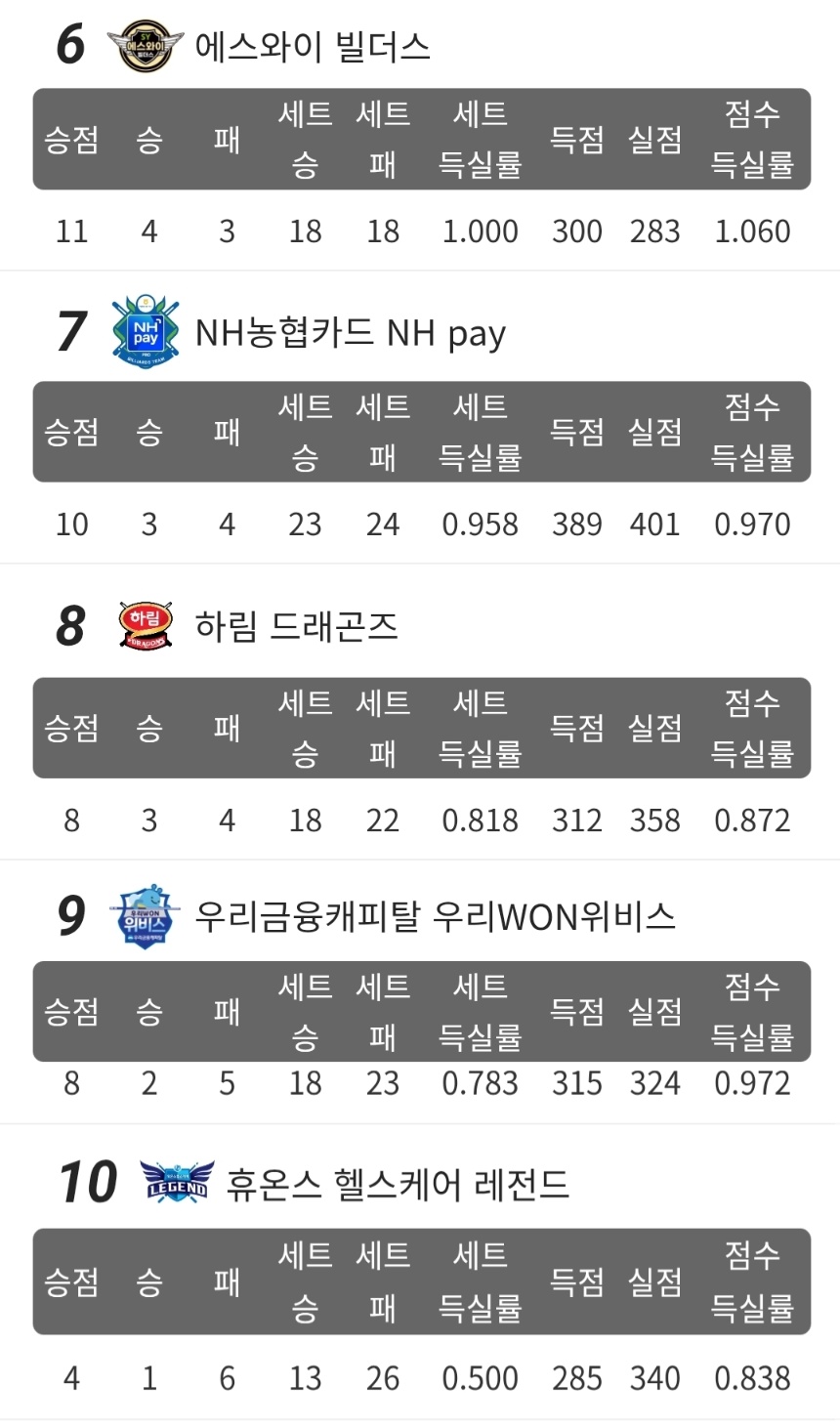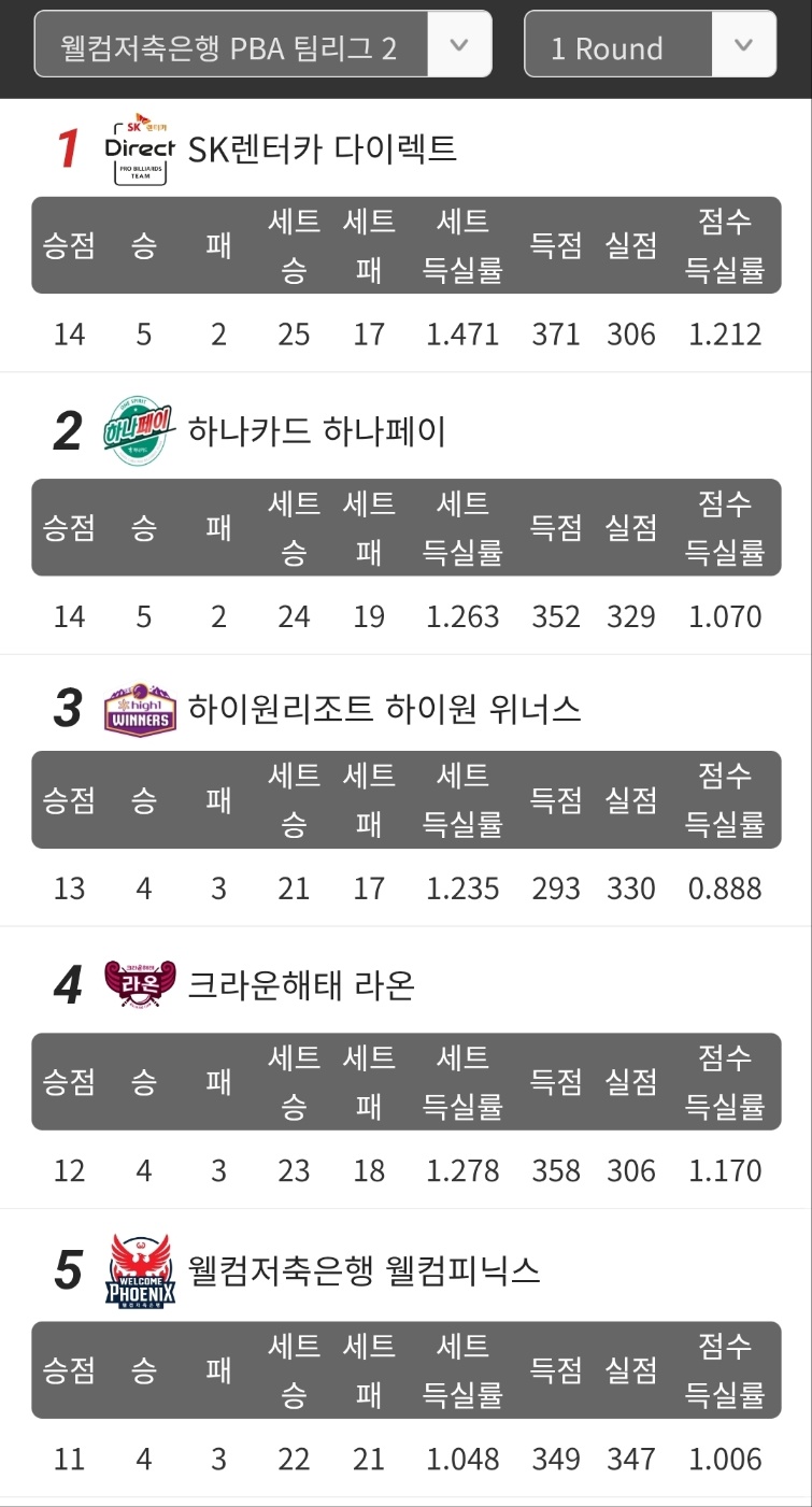하나카드 당구팀은 5승 2패로 1위와 동일하지만 세트 득실에서 조금 뒤쳐져 2위로 밀려났습니다. 3위부터 6위까지는 4승 3패로 승패는 모두 동일합니다. 그만큼 중위권 다툼이 치열한 상황입니다. .