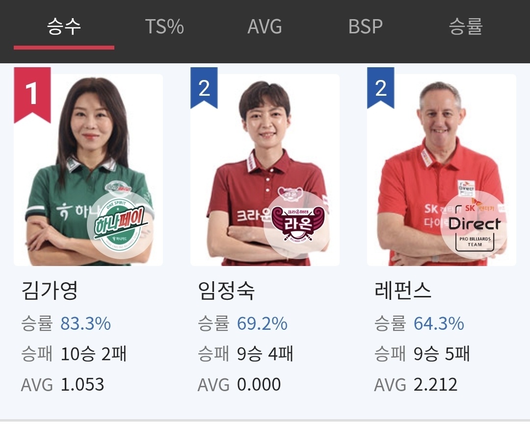 프로당구 2025-26시즌 1라운드 7일차 경기결과 개인 성적입니다. 현재 승수 1위를 기록하고 있는 김가영 선수입니다. 김가영은 현재까지 10승 2패를 기록하고 있습니다. 2위는 임정숙, 3위는 벨기에의 에디 레펀스입니다.