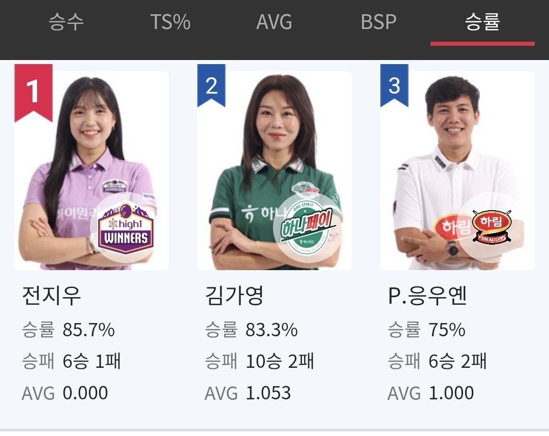 한편 1라운드 7일차까지 승류 1위를 기록하고 있는 당구선수는 전지우 입니다. 전지우 당구선수는 6승 1패로 승률 85.7%를 기록하고 있습니다. 승수 1위인 김가영 선수보다 승률이 높습니다.