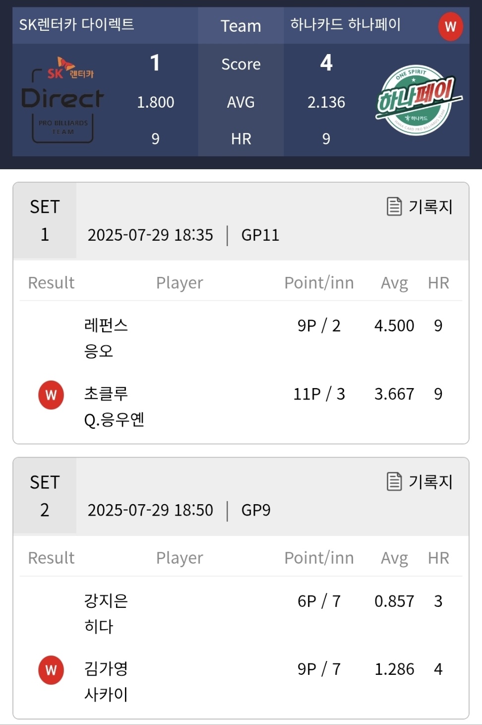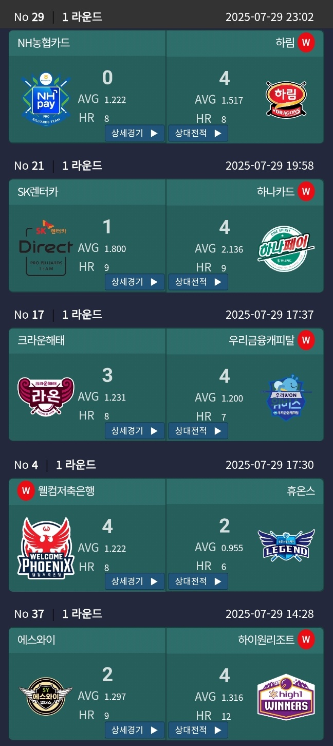 SK렌터카 VS 하나카드 당구팀 간의 경기에서는 하나카드 당구팀이 4대 1로 승리하면서 1라운드 우승에 한 걸음 다가섰습니다.
