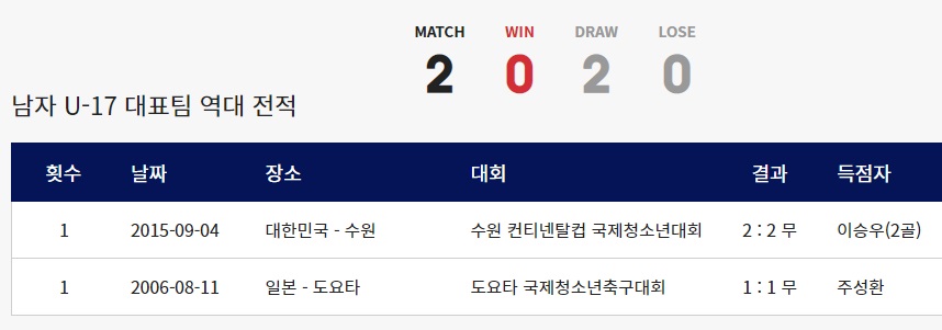 한국 vs 일본 남자 U-17 국가대표팀 역대 전적 : 2전 2무