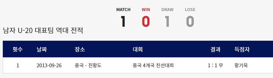 한국 vs 일본 남자 U-20 축구 국가대표팀 역대 전적 : 1전 1무