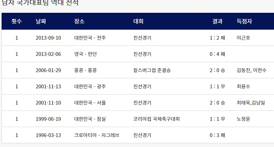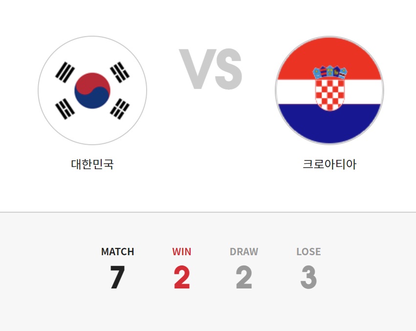 한국 vs 크로아티아 남자 축구 국가대표팀 역대 전적 : 7전 2승 2무 3패