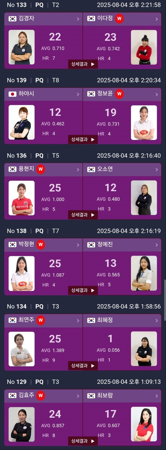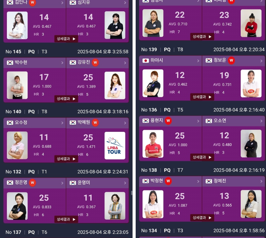 | NH농협카드 LPBA 챔피언십 PQ 라운드 대진표 - PPQ 경기결과 (25-26) (2) | 2025.08.03 |