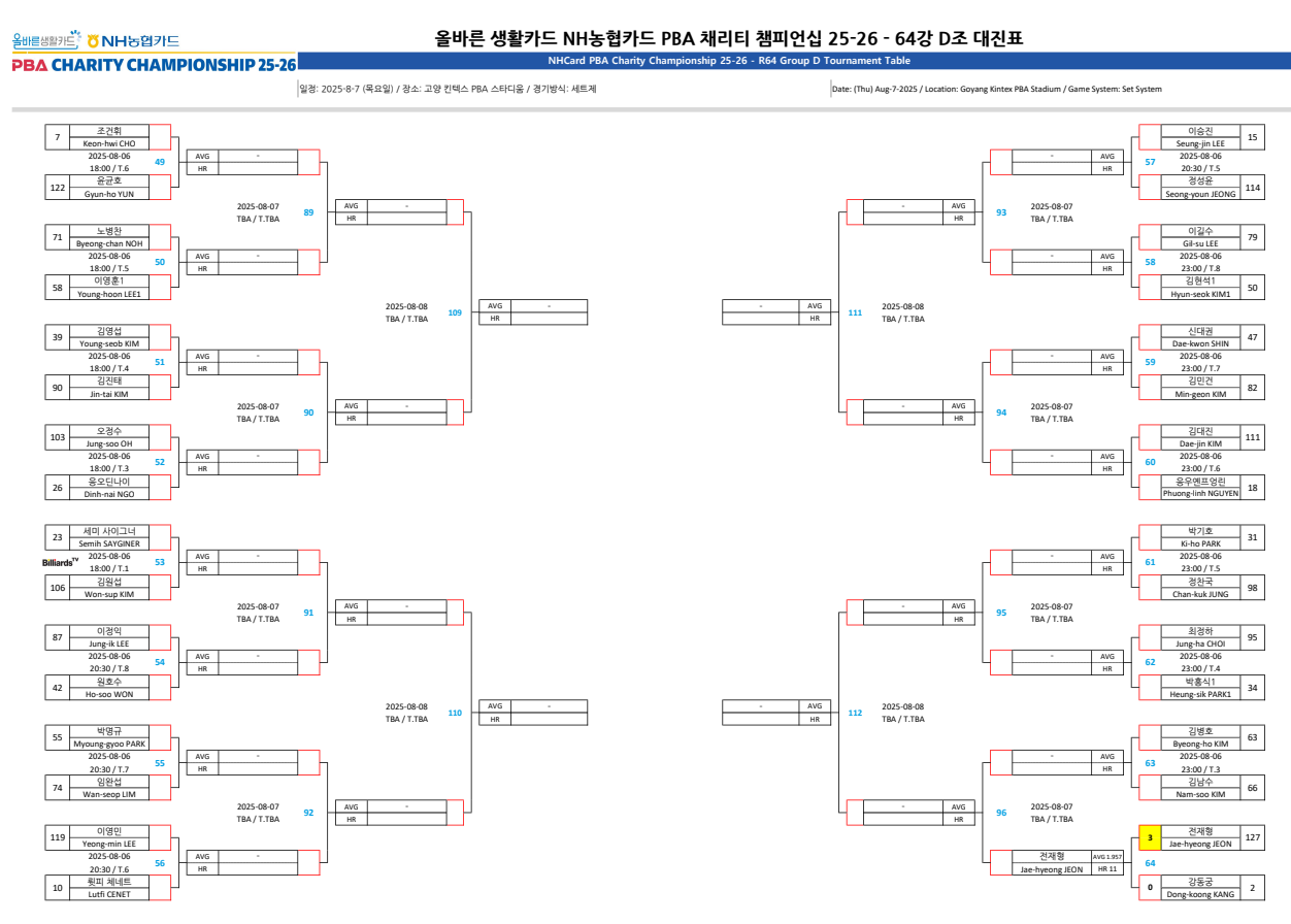 NH농협카드 PBA 채리티 챔피언십 25-26 64강 대진표 최종 자료는 128강 2일차 경기결과까지 나와야 확정 배포되는 점에 유의 바랍니다.