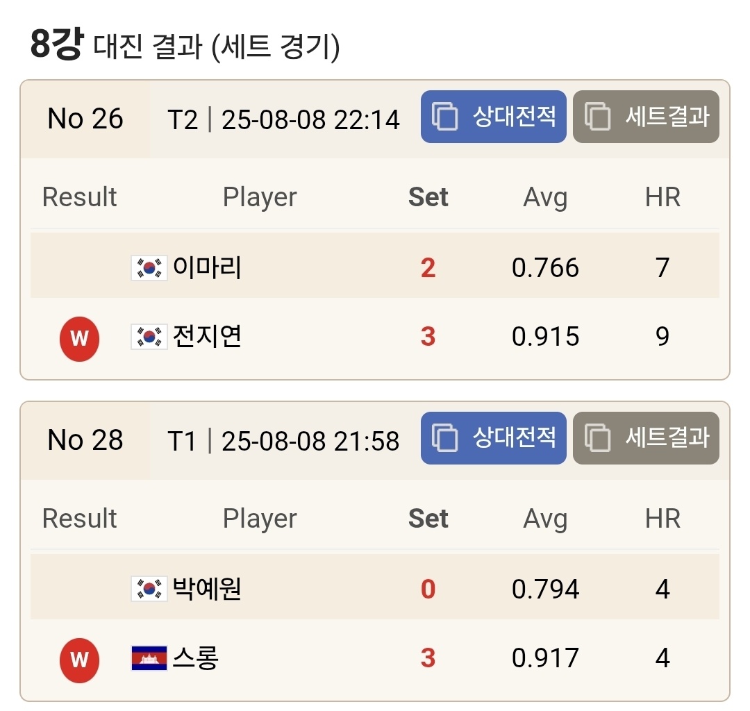히다 오리에, 임경진, 김다희를 꺽으면서 파란을 일으킨 박예원은 스롱 피아비의 벽을 넘지 못했습니다. 피아비는 매 세트 박예원에게 뒤졌으나 막판 뒤심을 발휘하면서 역전을 만들어 3대 0으로 이겼습니다.