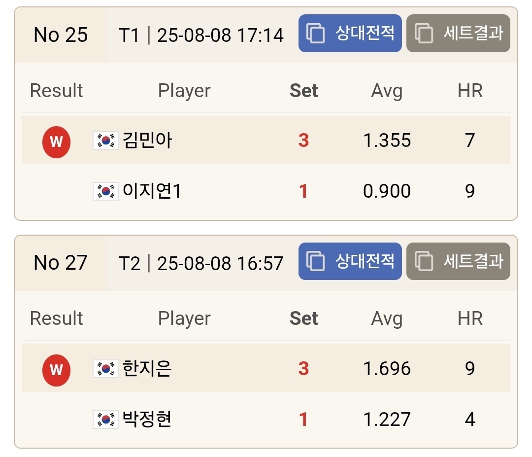 히다 오리에, 임경진, 김다희를 꺽으면서 파란을 일으킨 박예원은 스롱 피아비의 벽을 넘지 못했습니다. 피아비는 매 세트 박예원에게 뒤졌으나 막판 뒤심을 발휘하면서 역전을 만들어 3대 0으로 이겼습니다.