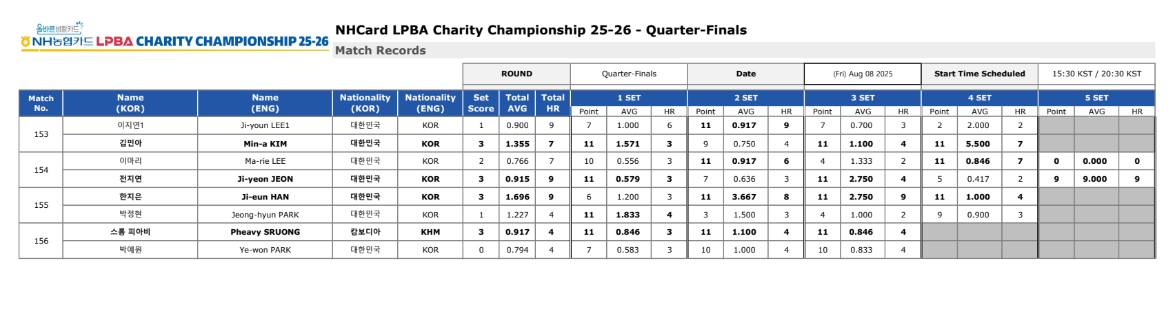 NH농협카드 LPBA 채리티 챔피언십 25-26 8강 경기결과