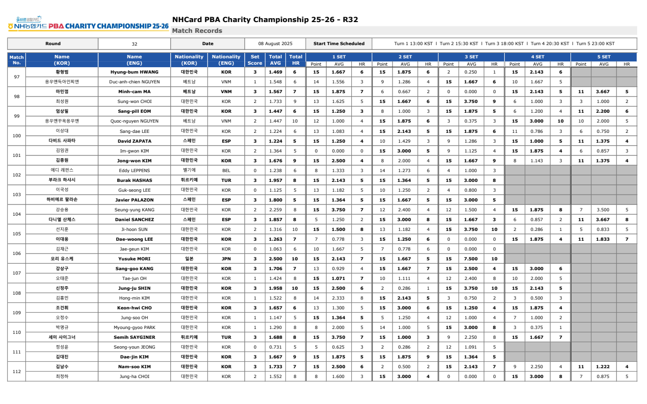 NH농협카드 PBA 채리티 챔피언십 25-26 32강 경기결과