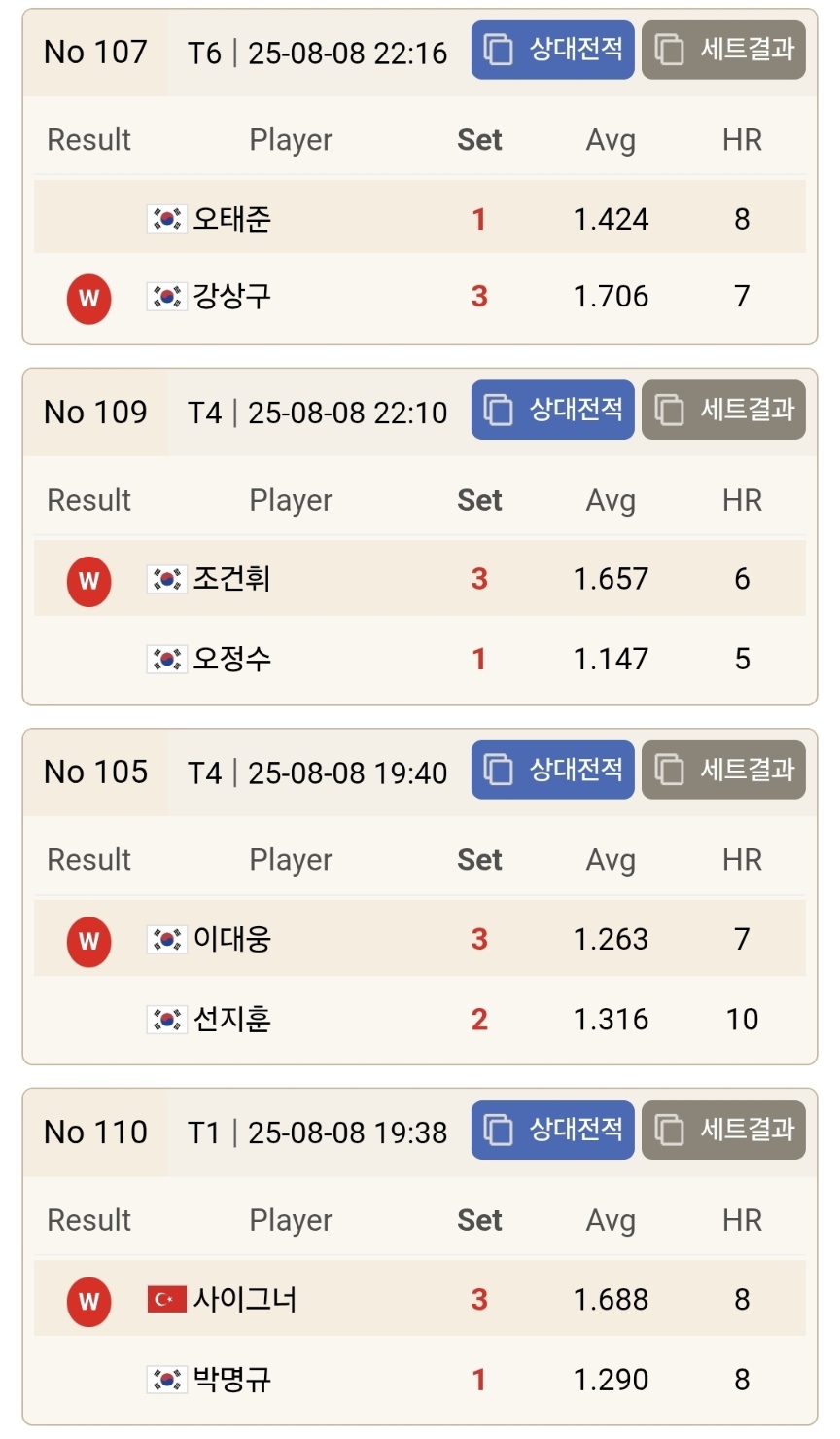 PBA 팀리그에서 방출된 황형범 선수도 16강에 진출하였습니다. PBA 챔피언 출신으로 신정주 선수가 좋은 경기력을 유지하고 있습니다.