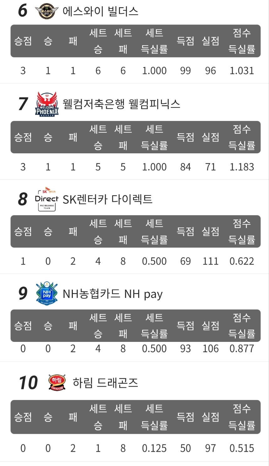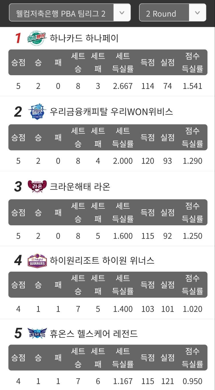 | PBA 팀리그 2라운드 1일차 경기결과 순위(25 - 26) - 1위 하나카드, 2위 웰컴 피닉스 (4) | 2025.08.18 |