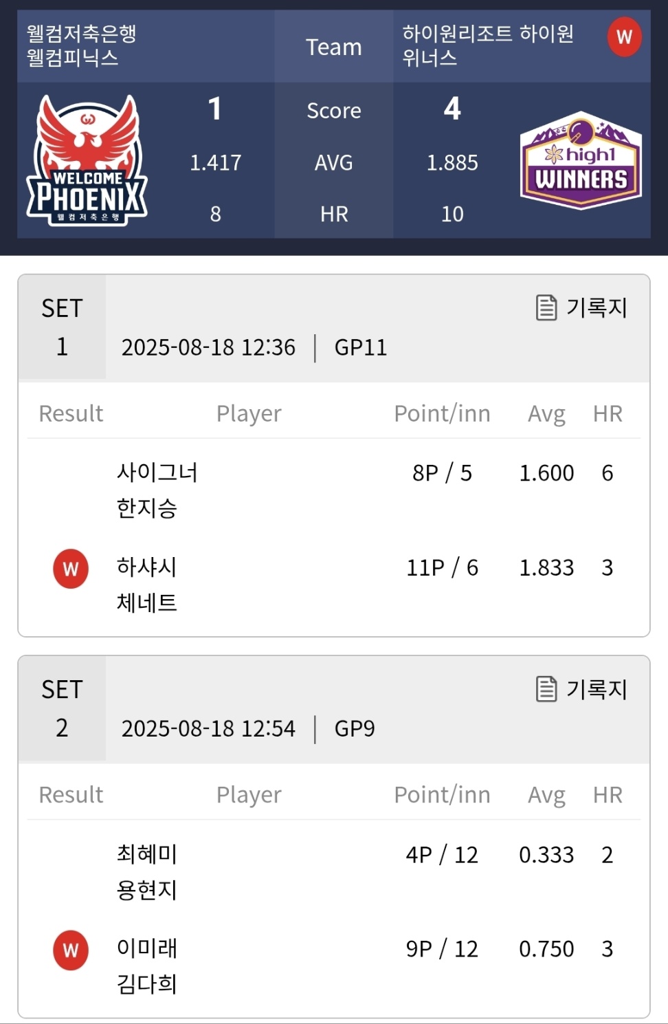 보미아빠 김병호 선수가 주장인 하나카드 당구팀은 최성원이 팀리더로 있는 휴온스 당구팀을 4대 3으로 이기고 승점 2점을 얻었습니다.