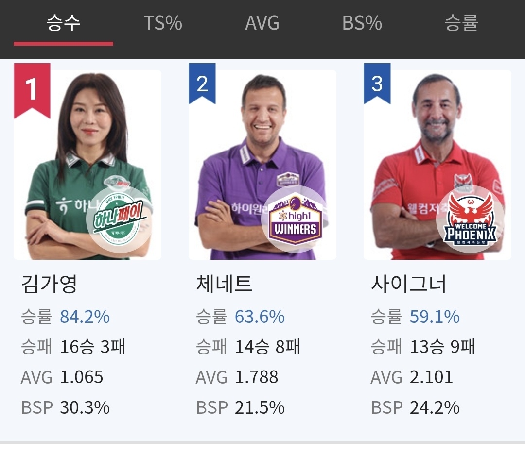 한편 1라운드 2일차까지 정규리그 현재 승률 1위를 기록하고 있는 당구선수는 김가영입니다. 김가영은 승률 84.2%를 기록하고 있습니다. 2위는 사카이 아야코, 3위는 전지우 당구선수입니다.
