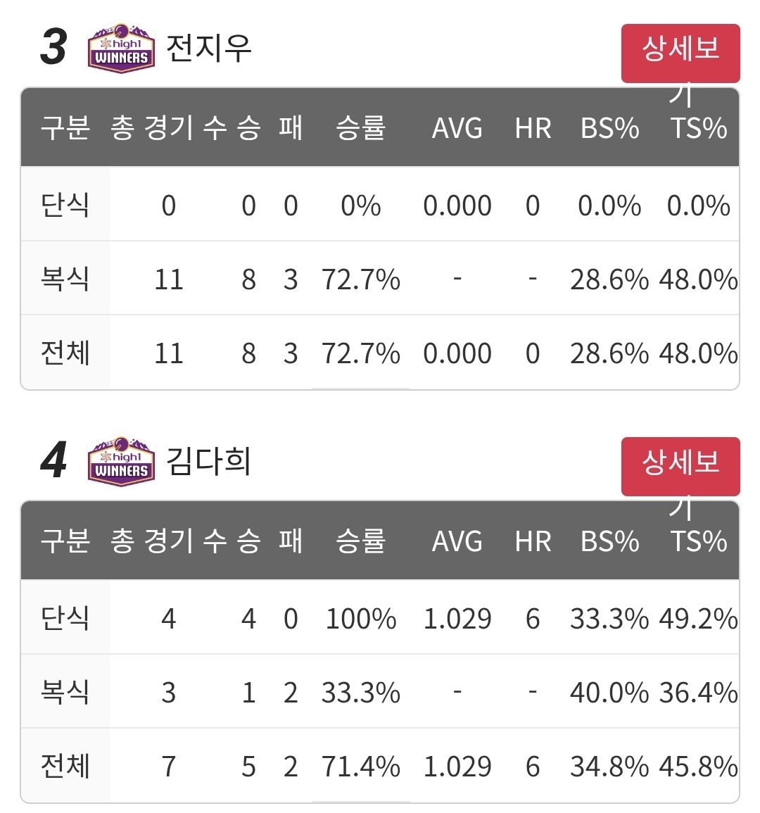 전지우는 지금까지 복식 11게임에서 8승을 거두었습니다. 김다희는 단식과 복식에 골고루 7게임 출전하여 5승을 거두었습니다.
