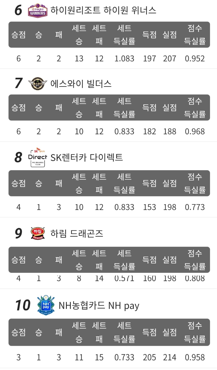 한편 1~ 3위까지 승점이 8점으로 동일하지만 세트득실을 따져 순위가 결정되었습니다. 앞으로 경기가 진행되면서 차이가 벌어질 수 있습니다. 또 휴온스 당구팀은 2라운드 최하위를 차지하였는데, 현재 승점 7점으로 바짝 추격하고 있습니다.