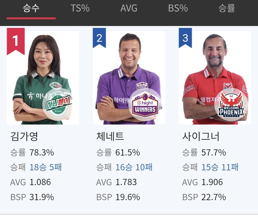 한편 2라운드 4일차까지 정규리그 현재 승률 1위를 기록하고 있는 당구선수도 김가영입니다. 김가영은 승률 78.3%를 기록하고 있습니다. 2위는 정수빈 선수의 연인으로 알려진 한지승, 3위는 사카이 아야코 선수가 올라 있습니다.
