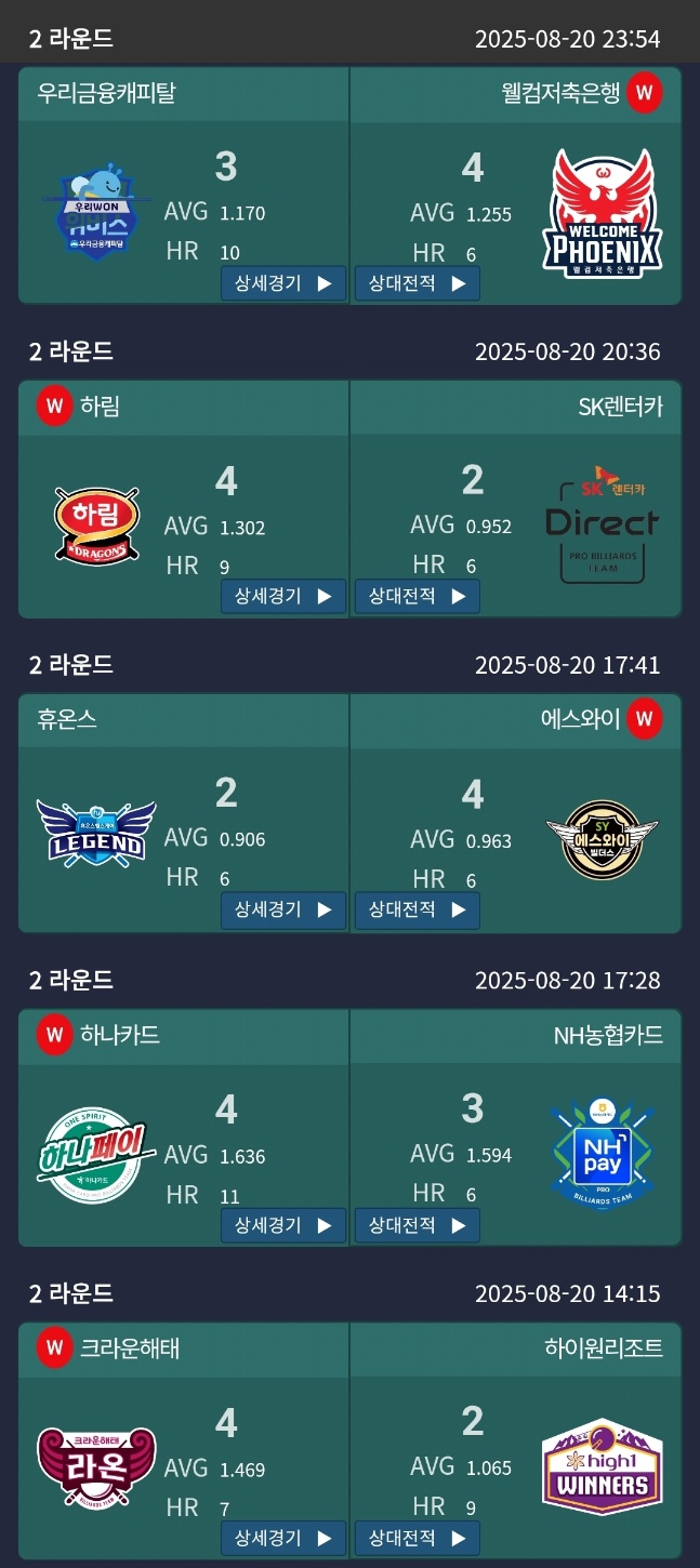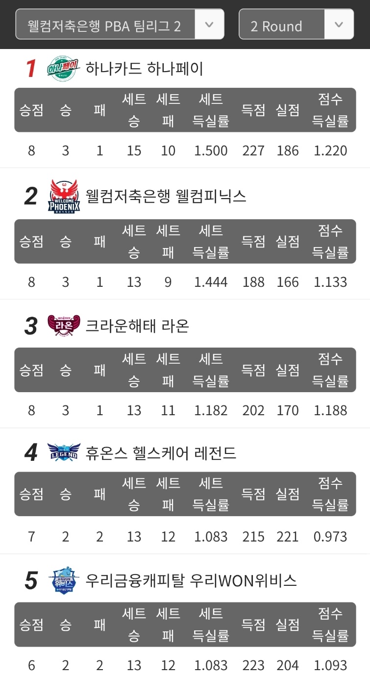 한편 1~ 3위까지 승점이 8점으로 동일하지만 세트득실을 따져 순위가 결정되었습니다. 앞으로 경기가 진행되면서 차이가 벌어질 수 있습니다. 또 휴온스 당구팀은 2라운드 최하위를 차지하였는데, 현재 승점 7점으로 바짝 추격하고 있습니다.