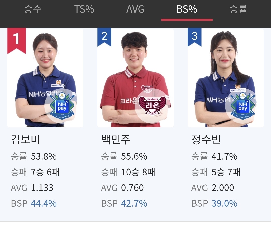 한편 2라운드 5일차까지 정규리그 뱅크샷 득점비율(BSP) 1위를 기록하고 있는 당구선는 김보미입니다. 김보미는 44.4%를 기록하고 있습니다. 2위는 백민주, 3위는 한지승 연인으로 알려진 정수빈 선수가 올라 있습니다.