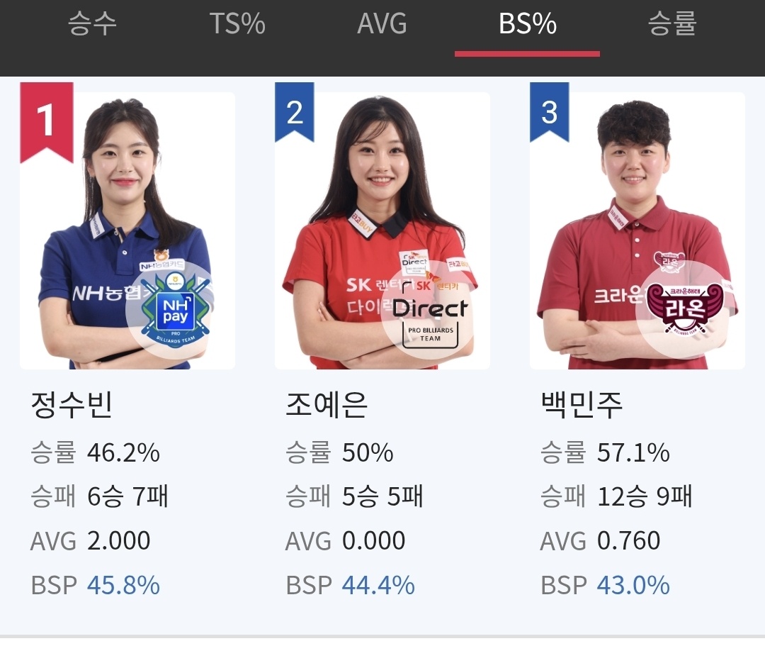한편 현재까지 정규리그 전체 뱅크샷 득점비율(BSP) 1위를 기록하고 있는 당구선는 정수빈 입니다. 정수빈 당구선수는 45.8%를 기록하고 있습니다. 2위는 SK렌터카 당구팀의 광고모델을 겸하고 있는 조예은, 3위는 백민주 선수가 올라 있습니다.