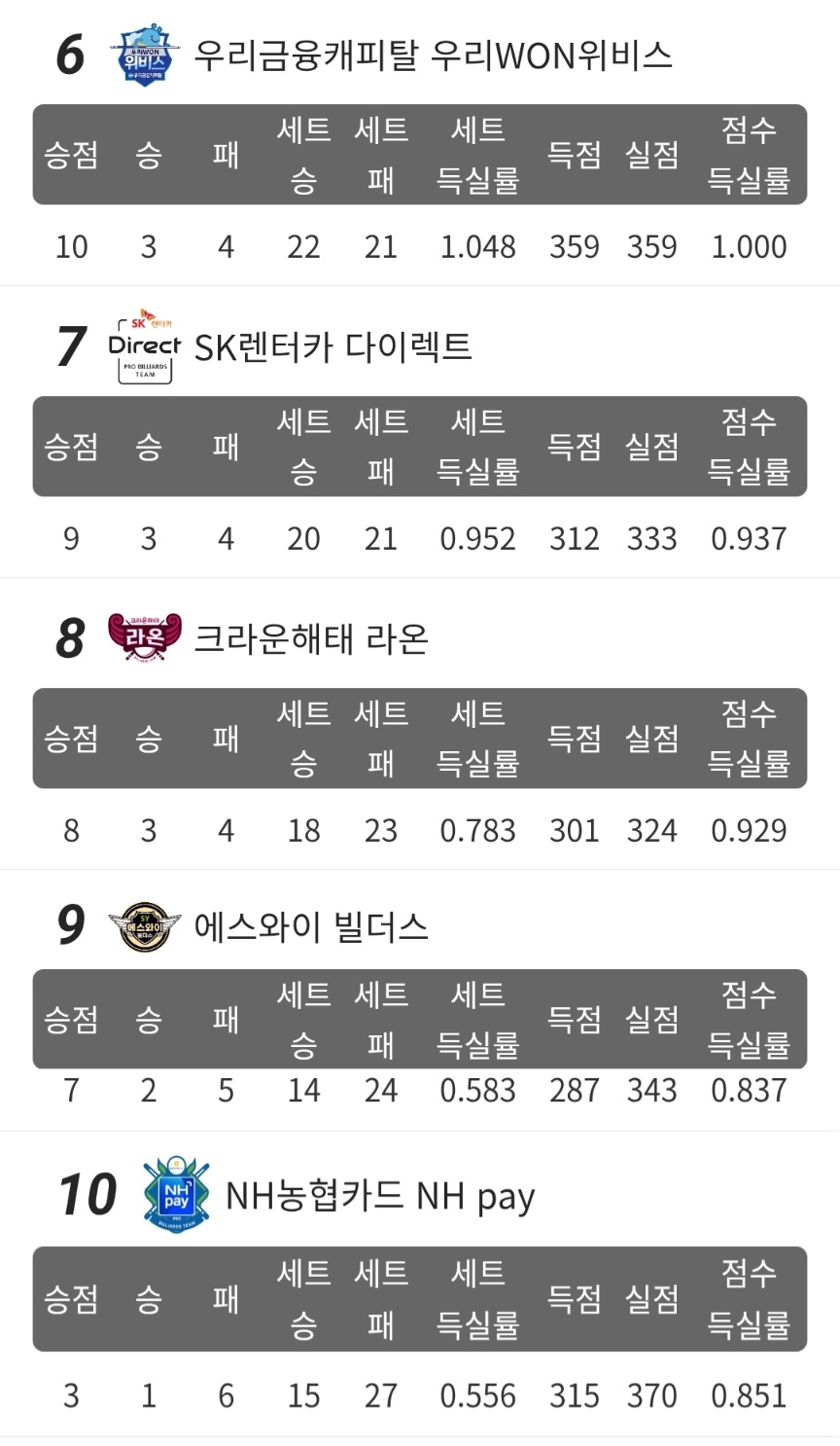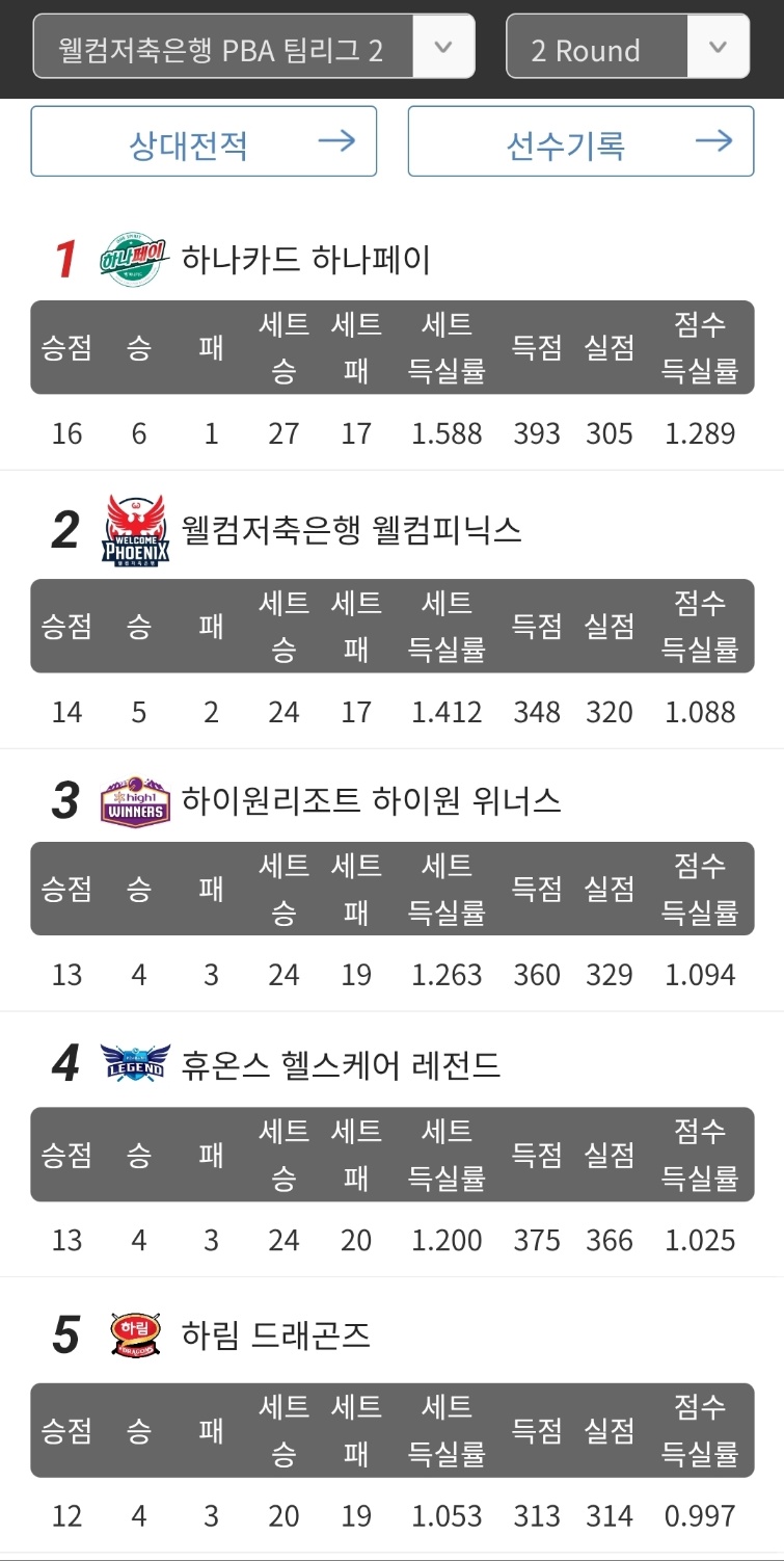 1위는 하나카드 당구팀 으로 하나카드는 6승 1패 승점 16점으로 다시 1위로 올라섰습니다. 2위 웰컴저축은행 당구팀입니다. 웰컴은 2라운드 5승 2패로 승점 14점을 기록하고 있습니다.